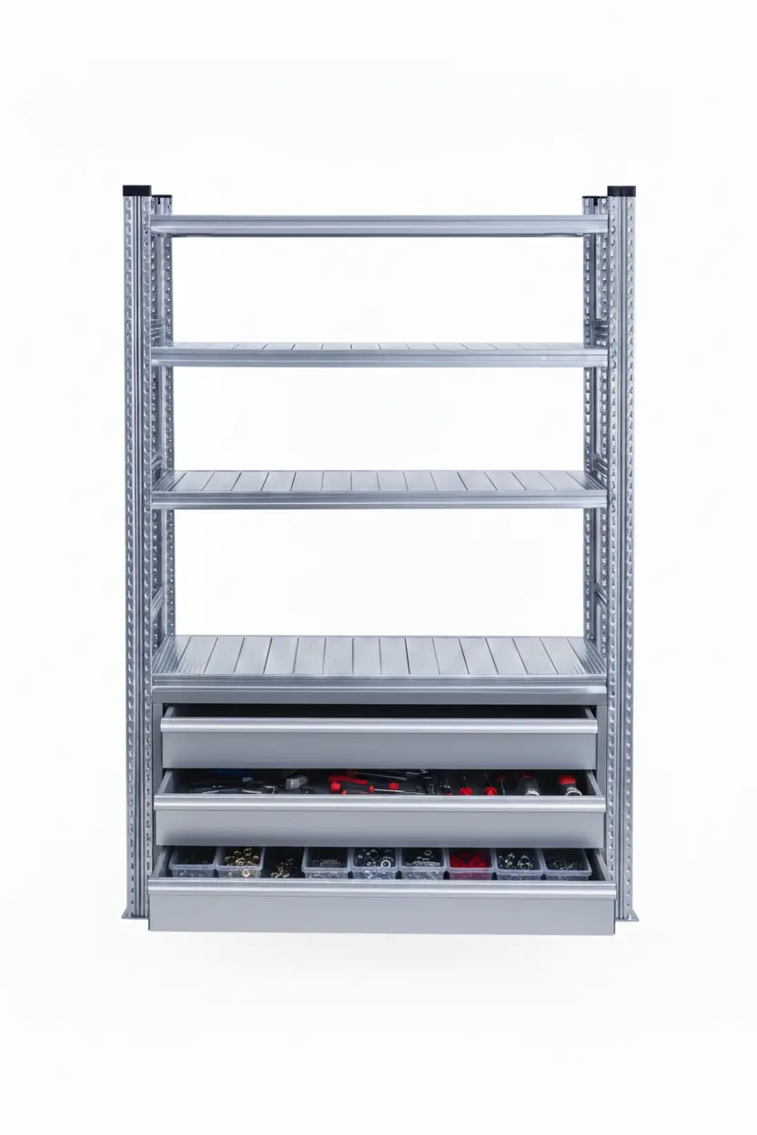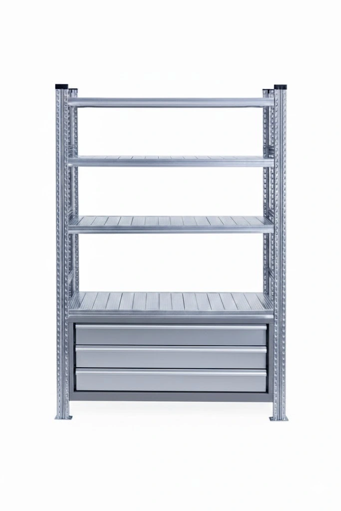 Organizza il tuo spazio con lo scaffale metallico con 3 cassetti e 4 ripiani Metalsistem, la soluzione professionale Made in Italy in acciaio zincato progettata per chi non vuole scendere a compromessi tra capienza e ordine. Grazie alla struttura modulare a incastro e ai cassetti integrati, è la scelta ideale per garage, magazzini, officine e ripostigli. Unisce la robustezza della scaffalatura metallica alla praticità dei cassetti, garantendo stabilità assoluta senza l’uso di viti o bulloni.